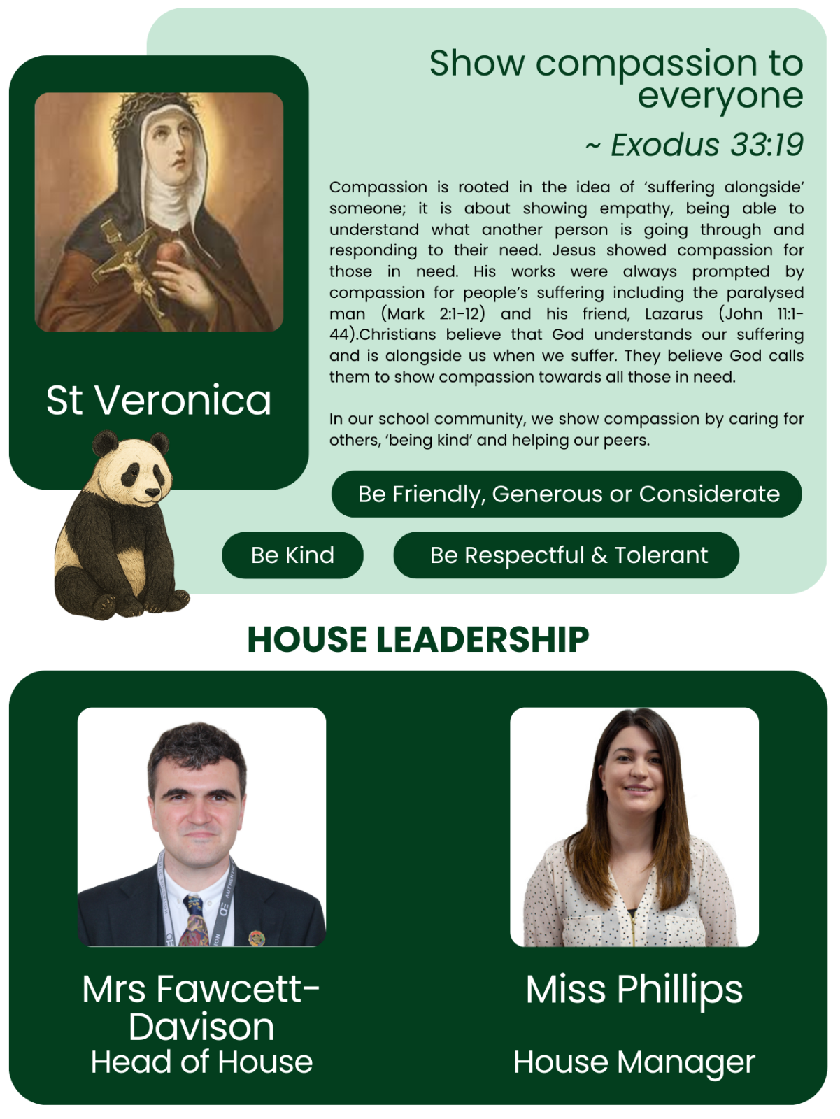 We are blessed in Saint Veronica House with a fantastic House Manager. Miss Phillips is always there for everyone in the house to provide a listening ear and support with attendance, behaviour and other issues that the students of Saint Veronica are facing. We are also lucky have a fantastic tutor team who serve as the first point of contact between home and school.
