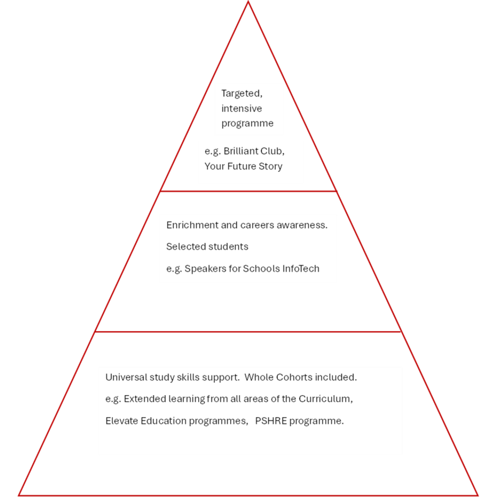 Year 8: The Speakers for Schools InfoTech Programme: provides students, with free access to tech-focused inspirational talks, employer insight days, and work experience, aiming to broaden their understanding of careers in the technology sector. The focus is on students who are Disadvantaged and/or female.