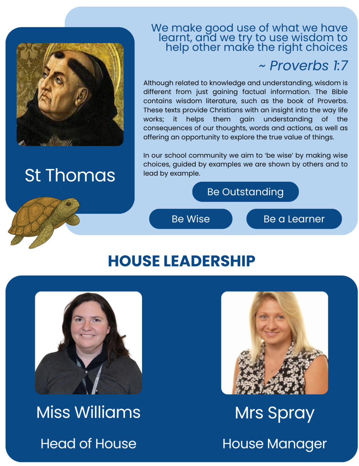 Thoughtful, considered and kind in everything we do. This is how I understand what it is to be in St Thomas House. Our inspiration is known for his scholarship, and this guides us in how we approach our learning in school, as well as the challenges of growing up and the learning opportunities it presents. We aim to frame every challenge as an opportunity to learn, and so to grow.