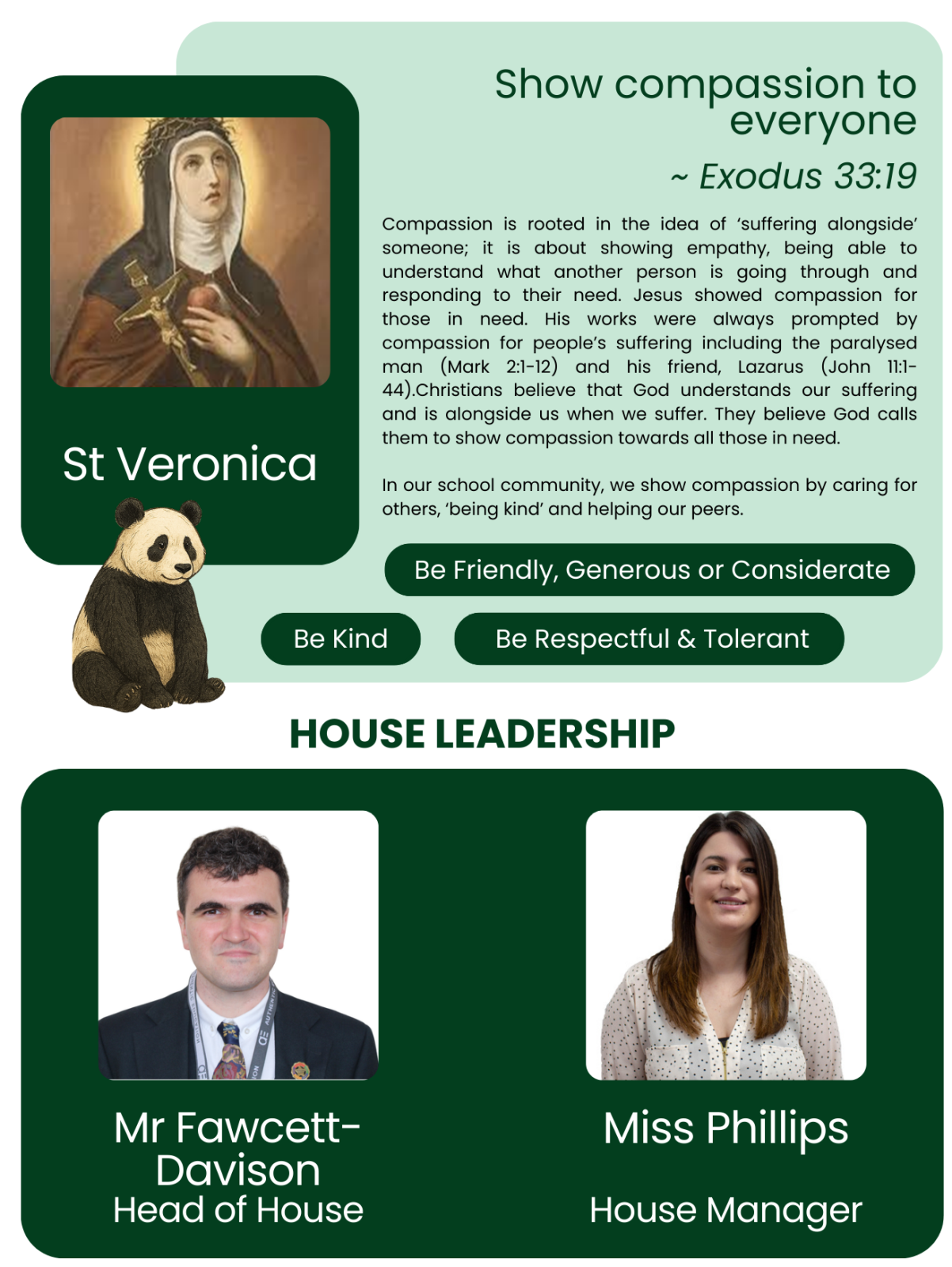We are blessed in Saint Veronica House with a fantastic House Manager. Miss Phillips is always there for everyone in the house to provide a listening ear and support with attendance, behaviour and other issues that the students of Saint Veronica are facing. We are also lucky have a fantastic tutor team who serve as the first point of contact between home and school.